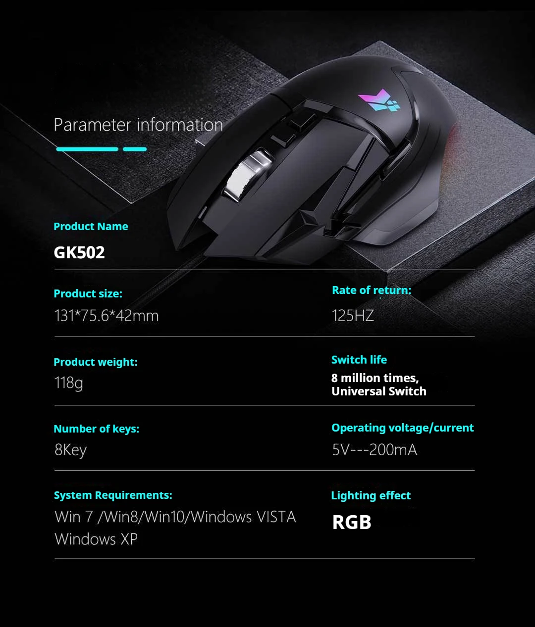 EQ-502-8B Ergonomic Optical 502-8B RGB Backlit 8 BTN Gaming Mouse Brand Quality 7200DPI Wired USB Macro Programmable for Desktop Gamers
